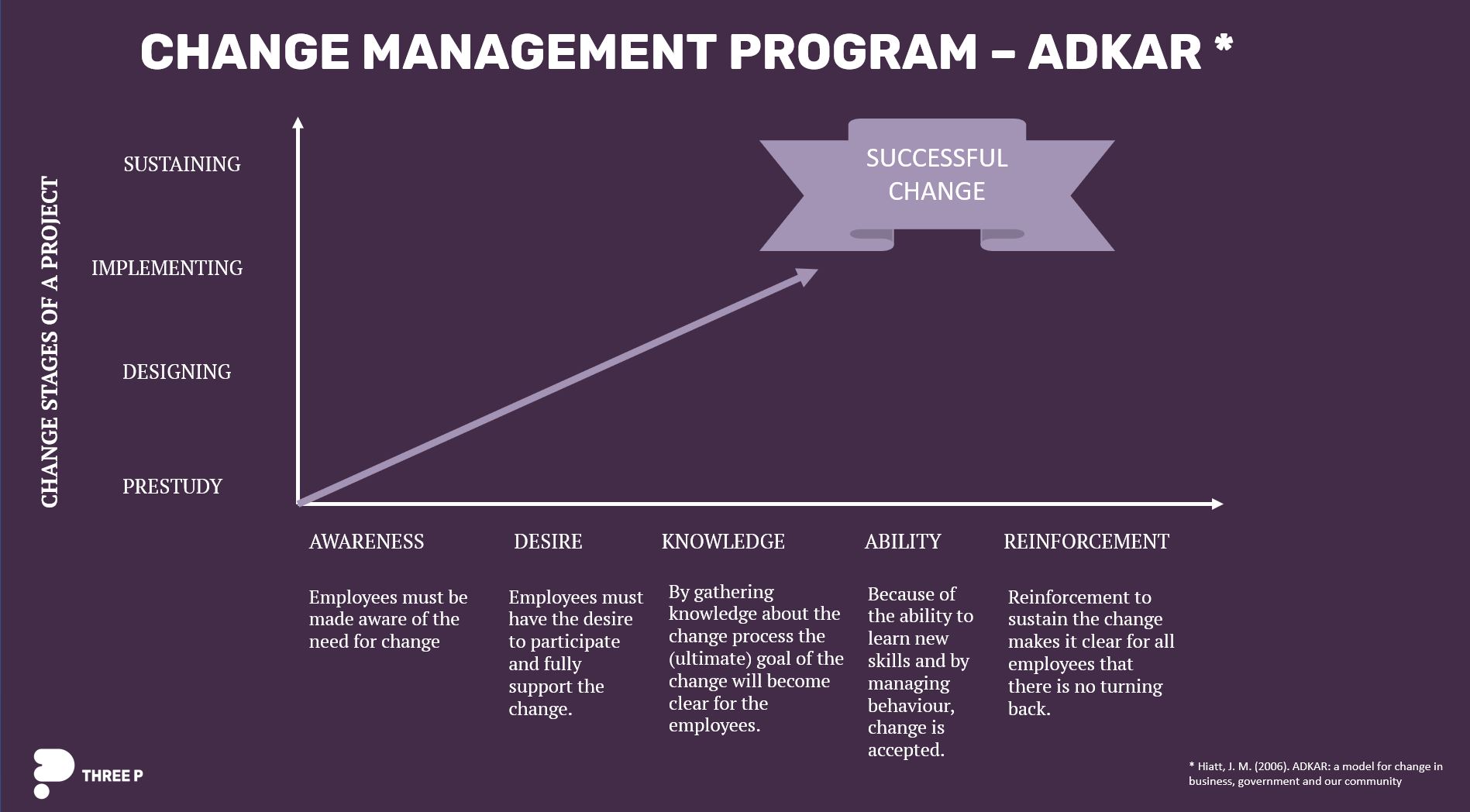 Three P har stor erfarenhet av att driva Change Management projekt. Vi arbetar enligt en egenanpassad modell av en arbetsmetodiken som kallas ADKAR. Vi börjar oftast med en förstudie för att kartlägga och skapa medvetenhet om det som behövs förändras. Sedan går vi igenom de olika stegen för att till slut nå en hållbar och implementerad lösning som ger den effekt och resultat som företaget önskar.